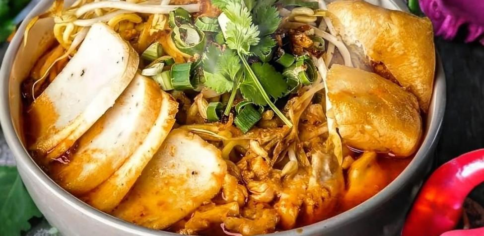 Mildly spiced coconut soup with Hokkein noodles, bean curd, bean sprouts, fish cake (except vegetables) and choice of protein.