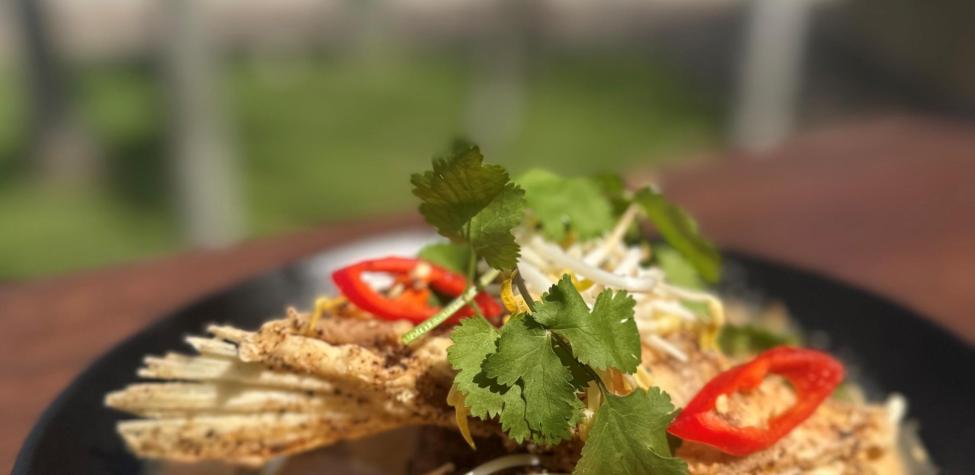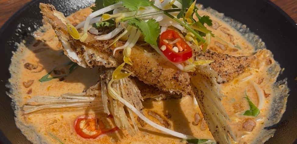 Crispy, golden-fried NT barramundi wings served in a rich, aromatic laksa-inspired broth. The crunchy skin gives way to tender, juicy flesh, soaking up the bold, coconut-spiced flavours beneath. A perfect entrée for two—local, vibrant, and packed with a taste of the Territory