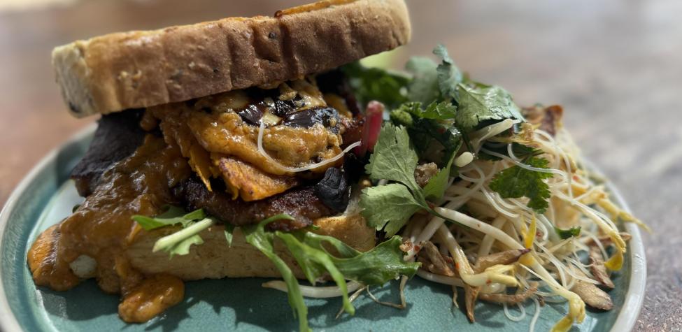 Slow cooked brisket, roast pumpkin, brie cheese, caramelised onion, and our special spicy laksa sauce and locally made Palmerston bakery thick cut toast with a noodle side salad