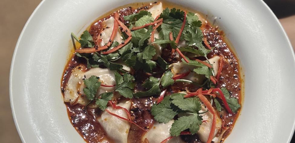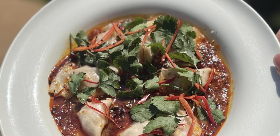 Nepalese inspired chicken jhol momo with infusion of laksa broth, herbs and spices. Garnished with chilli and corriander