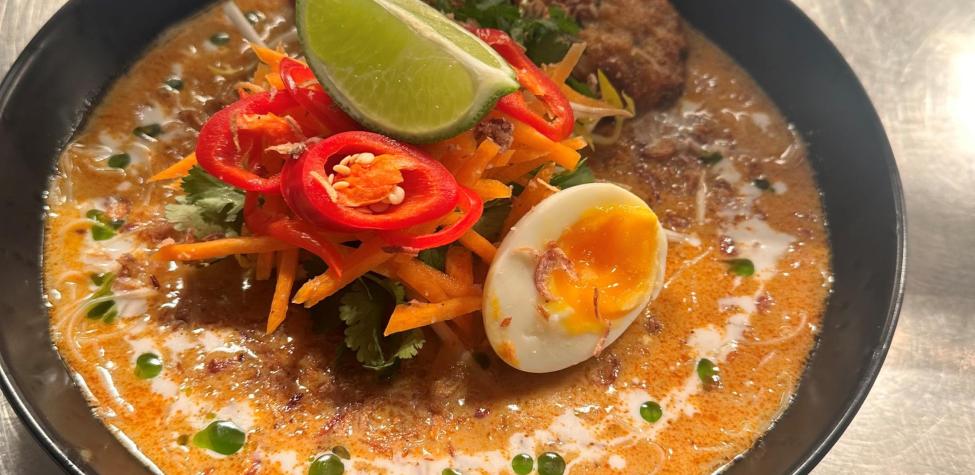 Sea food Laksa made from Mud crab broth, coconut cream as a base and topped with rice noodles, tofu, prawn and barra fritters, bean sprouts, red chilies, coriander, Jullian carrots, red radish, egg, fried shallots, and lime wedge, with a dash of coriander oil.