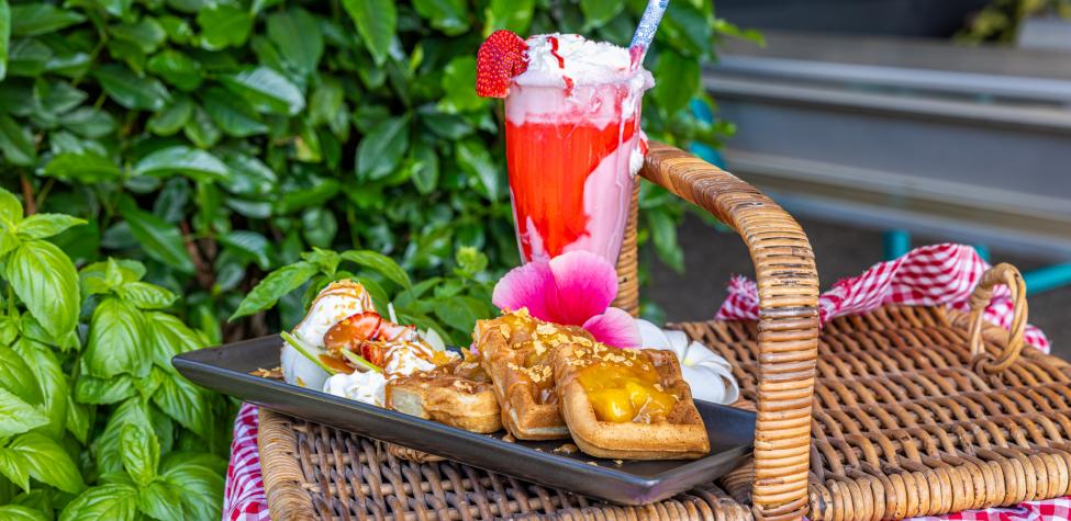 A golden waffle topped with creamy coconut ice cream, fresh fruit, sweet mango compote, and a laksa inspired caramel-chilli syrup.