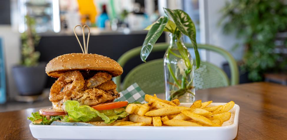 A golden crispy chicken burger stacked high with onion rings, tomato and lettuce, finished with creamy chilli aioli. Comes with a side of smoky paprika-chilli fries.